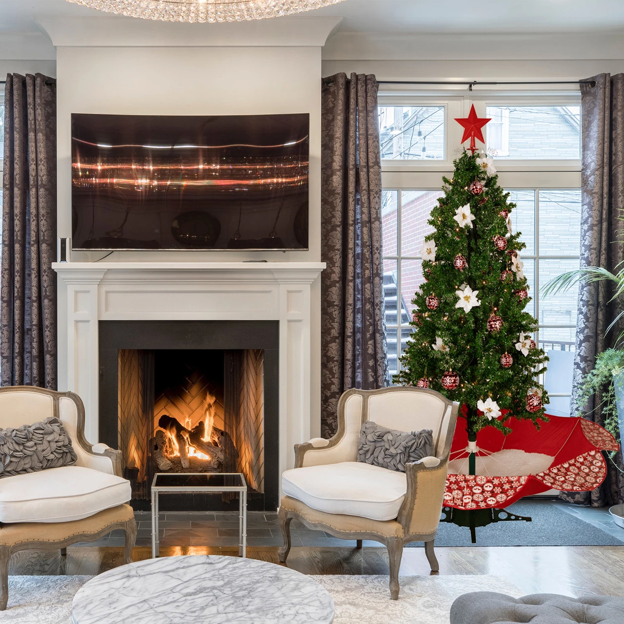 Includes shatterproof red ball ornaments with white designs