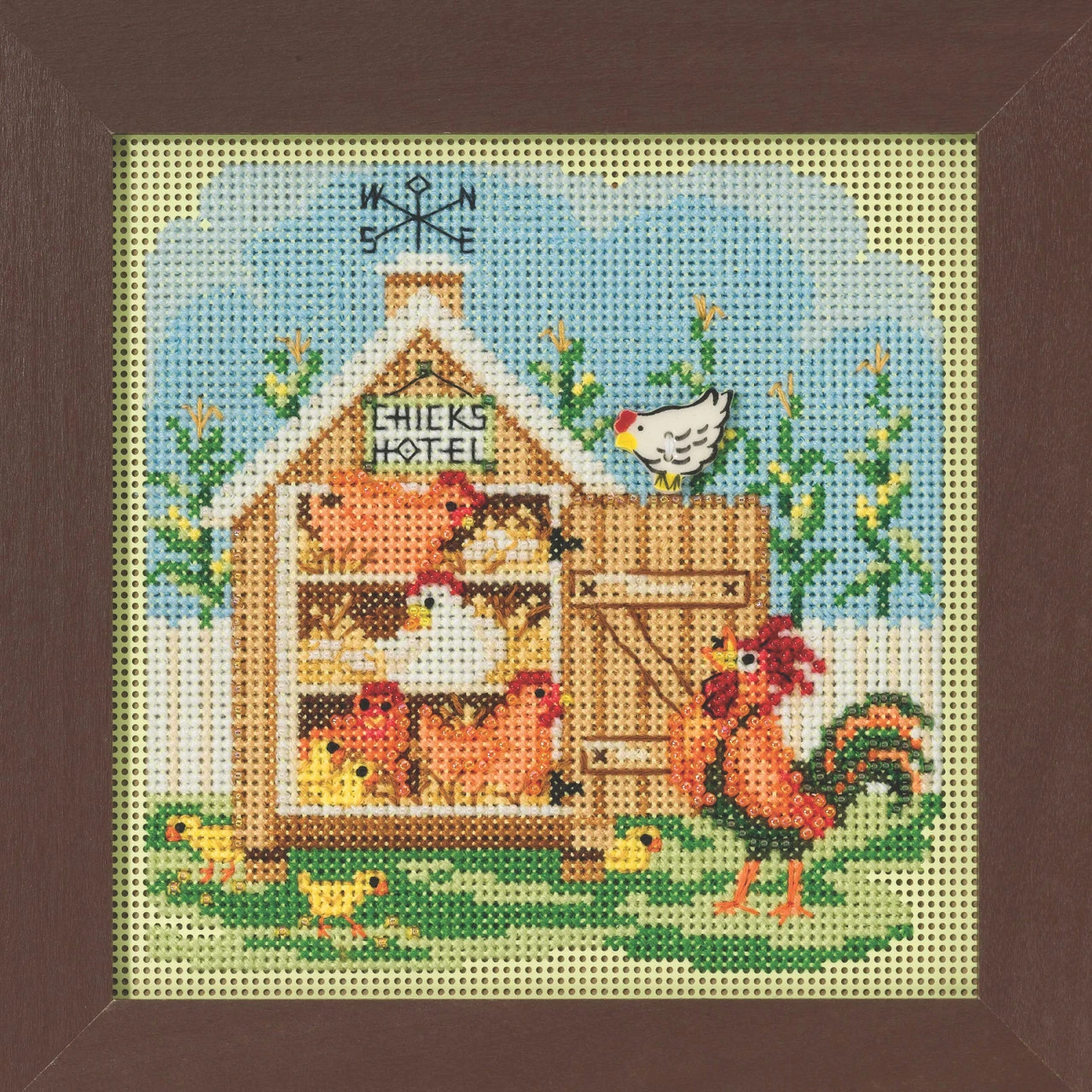 Chicks Hotel Beaded Cross Stitch Kit Mill Hill Buttons & Beads 2022 Spring Series MH142214 The chickens are roosting at the Chicks Hotel! Makes one Chicks Hotel design suitable for framing. Kit design is stitched on included 14 Count Perforated Paper. Alternatively, design can be stitched on 28 Count fabric (not included) for use on pillows, purses, and other fabric-based projects. Approximate Design Size: 5.25 x 5.25 inches (13.4 x 13.4 cm) Materials Included: Mill Hill Glass Beads, Mill Hill Ceramic Button, Mill Hill 14 Count Painted Perforated Paper, floss, needles, and chart with instructions. Materials Recommended: 6 x 6 Chocolate Mill Hill Solid Color Wooden Frame GBFRM4 (sold separately). Copyright 2022 Mill Hill. Kit packaged by Wichelt Imports, Stoddard, Wisconsin. Parts from USA, UK, France, and Japan. Not recommended for children under 9 years of age. Chicks Hotel Beaded Cross Stitch Kit – Mill Hill Buttons & Beads 2022 Spring Series MH142214