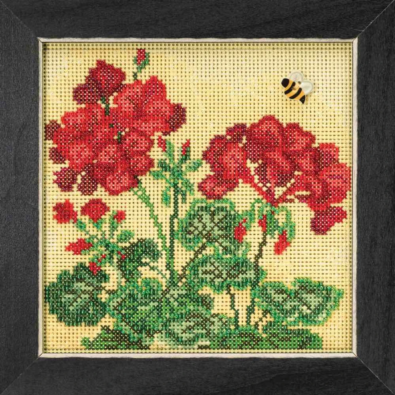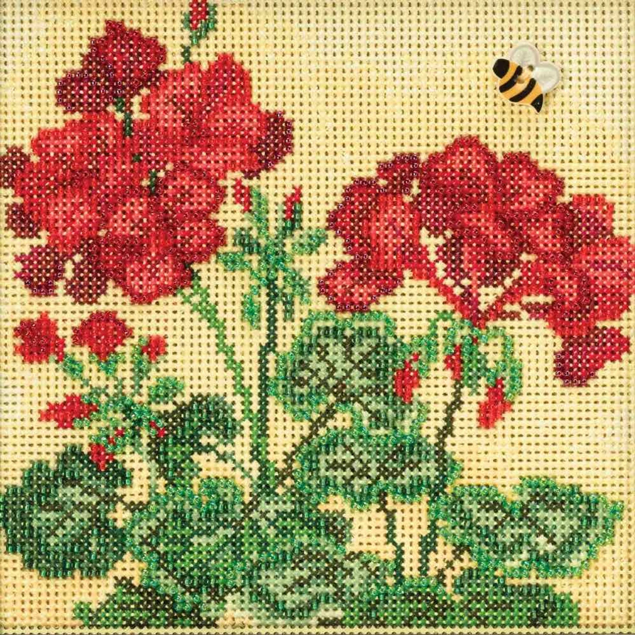 A colorful red Geranium with a buzzy bee! Makes one Geranium design suitable for framing. Kit design is stitched on included 14 count painted perforated paper. Alternatively, design can be stitched on 28 count fabric (not included) for use on pillows, purses, and other fabric-based projects.