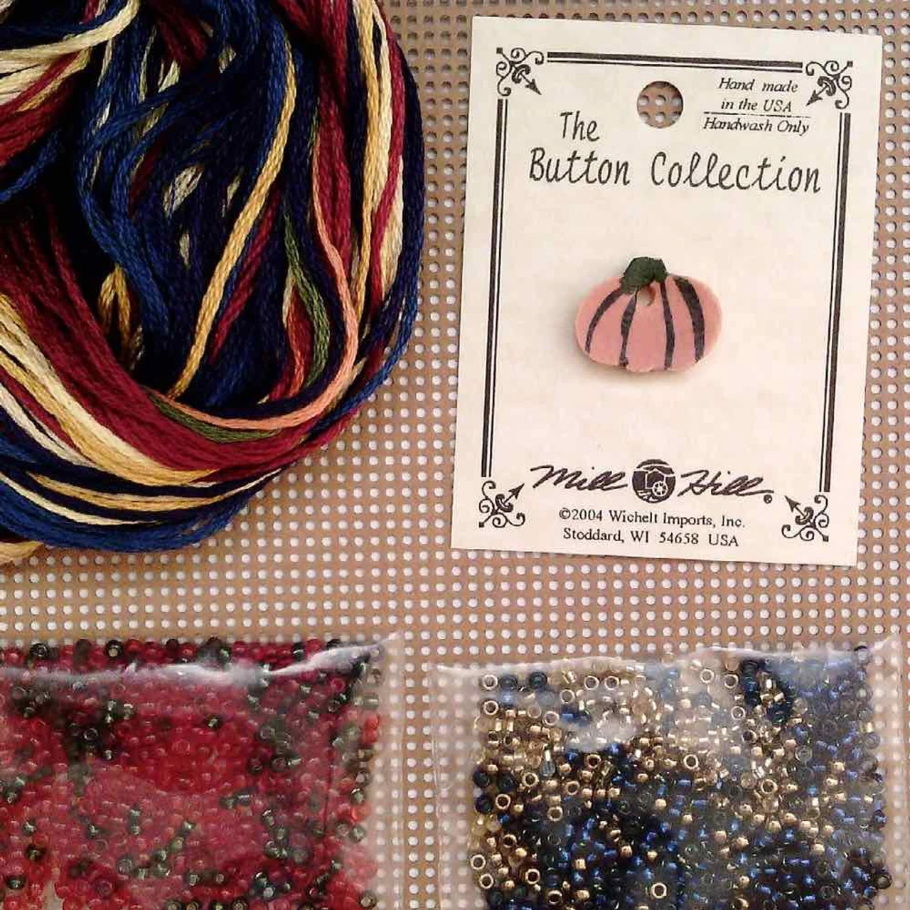Materials Included: Mill Hill Glass Beads, Mill Hill Ceramic Button, Mill Hill 14 Count Perforated Paper, floss, needles, and chart with instructions