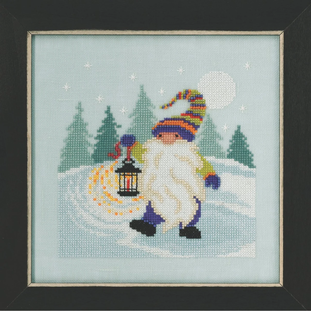 Hiking Gnome, one of a quartet of kits, all stitched on 28 Count Linen fabric and suitable for framing.