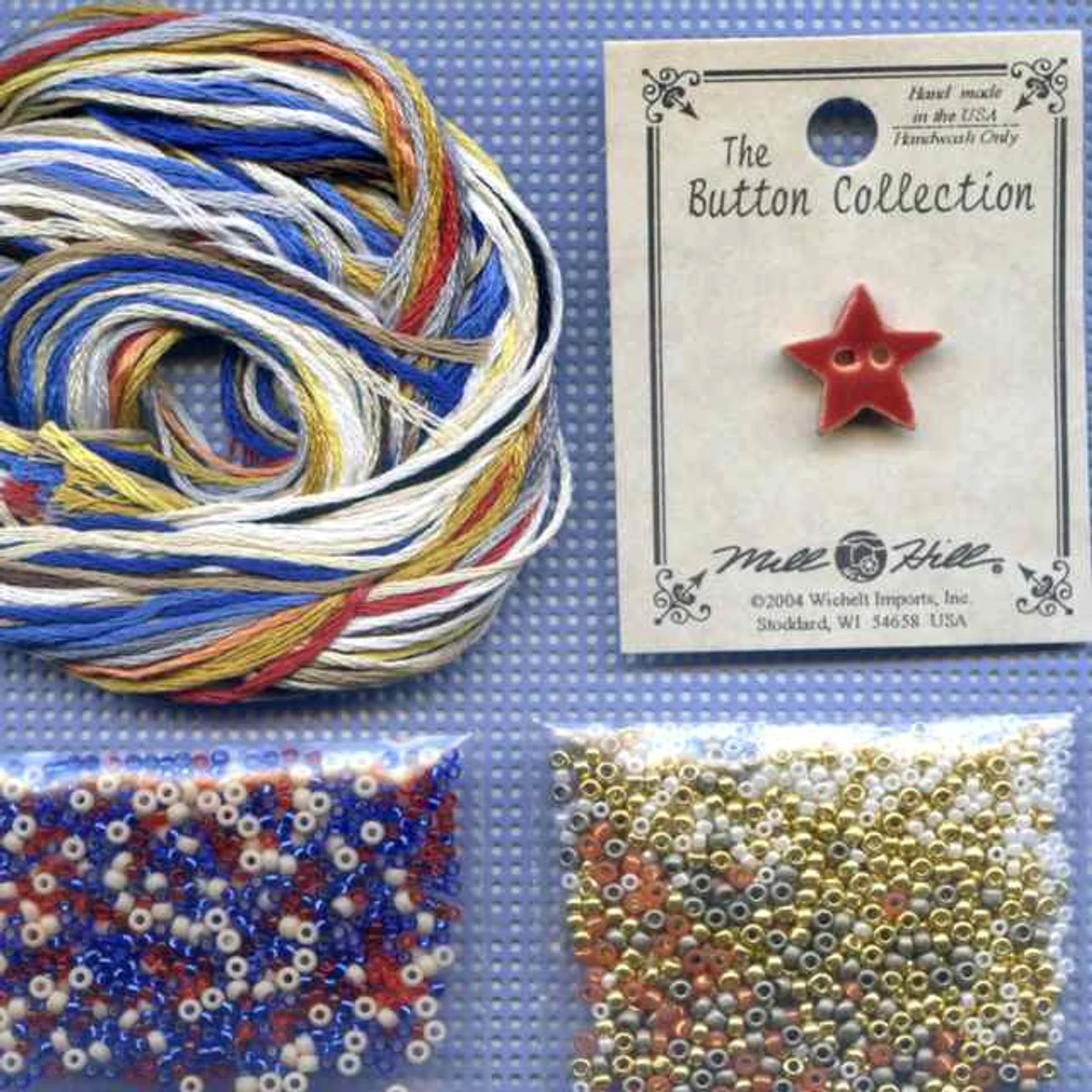 Materials Included: Mill Hill Glass Beads, Mill Hill Small Red Star Ceramic Button, Mill Hill 14 Count Painted Perforated Paper, floss, needles, and chart with instructions