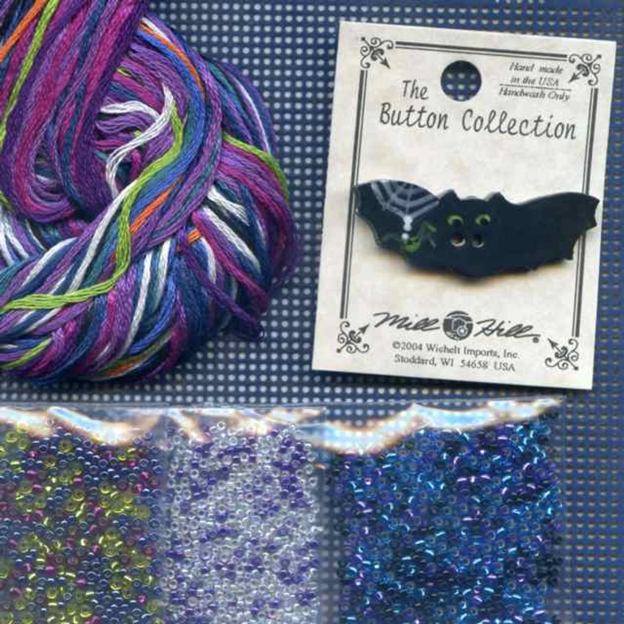 Materials Included: Mill Hill Glass Beads, Mill Hill Bat Ceramic Button, Mill Hill 14 count Painted Perforated Paper, floss, needles, and chart with instructions