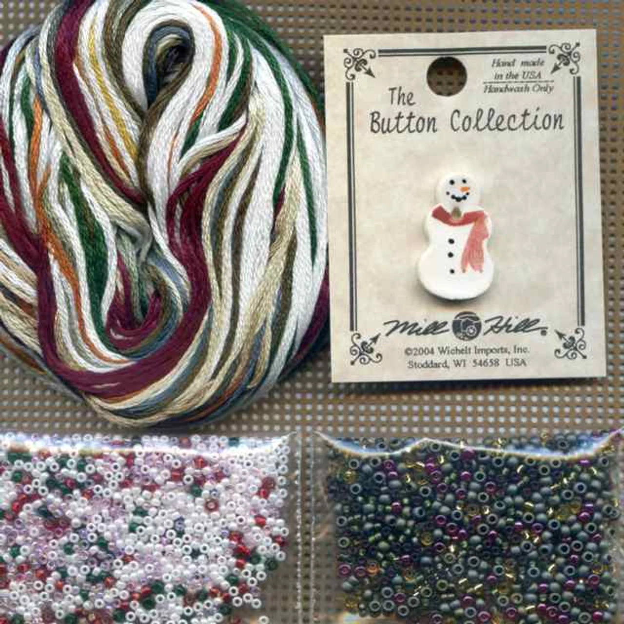 Materials Included: Mill Hill Glass Beads, Mill Hill Petite Snowman Ceramic Button, Mill Hill 14 Count Perforated Paper, floss, needles, and chart with instructions